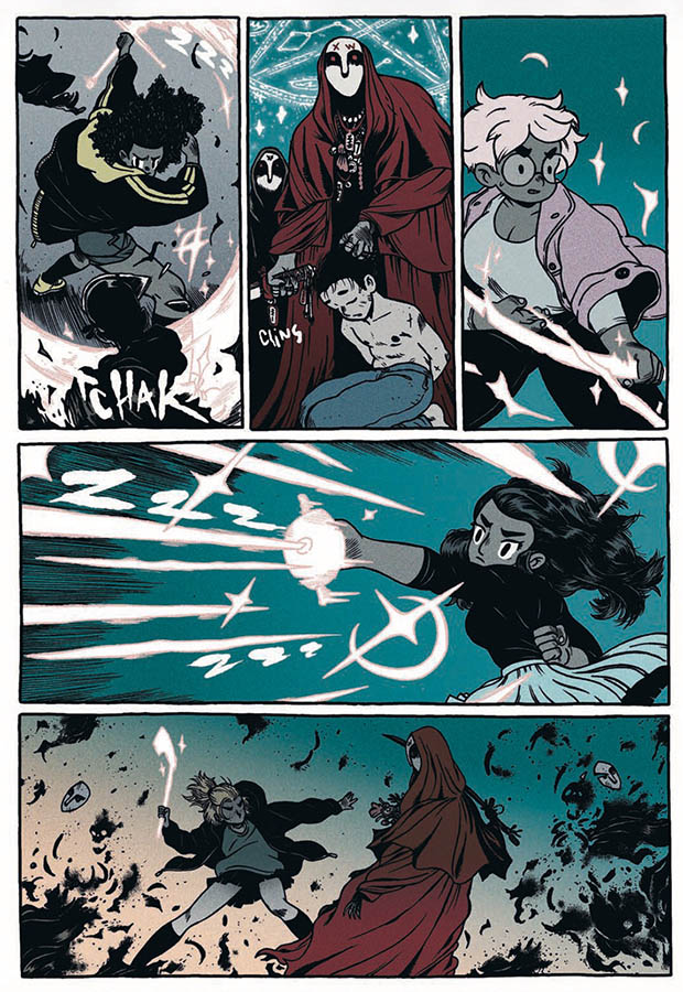 On retrouve aux pinceaux et à la plume dans Midnight TalesMathieu Bablet, évdiemment, mais aussi Elsa Bordier, Gax, Florent Maudoux, Rebecca Morse, Clément Rizzo, Sourya Sihachakr, Guillaume Singelin, Da Coffee Time, Mathilde Kitteh, Thomas Rouzière, Baptiste Pagani, The NEB studio, Thomas Gilbert, Neyef et Loïc Sécheresse. Ce projet collectif se veut un hommage aux magazines pulp des années 40 comme Tales from the crypt ou Horror, inspiré par l’univers des magical girls, et notamment Charmed, Buffy contre les vampires ou encore Sailor Moon. Des inspirations qui servent de fil conducteur aux récits mettant en scène des sorcières aux quatre coins du monde et à diverses époques, chassant les esprits malveillants qui s’en prennent aux moldus au nom de l’Ordre de Minuit, une organisation secrète séculaire qui protège le monde de ces abominations.
