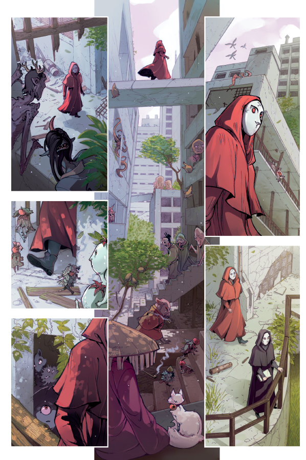 J’ai également retenu Devil’s Garden, dont la première partie est dessinée par Gax, quand la deuxième a été confiée à Mathilde Kitteh. Les deux styles graphiques sont totalement opposés, mais ils se répondent d’une belle manière. J’ai un peu de mal à définir le trait de Gax, c’est très primitif et coloré à la fois, il y a comme une brume noire qui parcourt les cases si bien qu’on semble être nimbé dans un cocon cauchemardesque, un peu comme la protagoniste qui n’est pas bien sûre d’être dans le monde réel. Mathilde Kitteh, quant à elle, offre un style plus aéré et des personnages aux traits expressifs à la manière d’un manga. J’ai aimé sa jeune héroïne, Chantira, puissante sorcière qui vit à la marge grâce aux combats de rue qu’elle remporte. Sa magie n’y est pas pour rien, et l’Ordre n’apprécie pas vraiment cette utilisation en dehors des clous. Son destin tragique m’a profondément touchée. Une troisième partie deDevil’s Garden est proposée vers la fin de l’ouvrage, dessinée par Thomas Gilbert. On part cette fois-ci en Transylvanie, dans un village reculé où les croyances occultes sont bien ancrées chez les habitants…