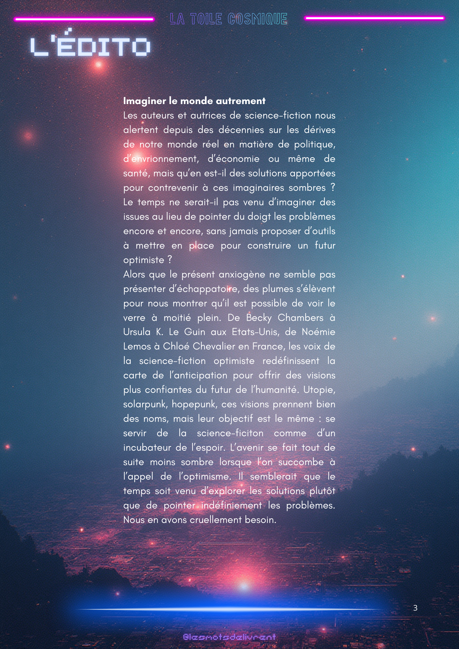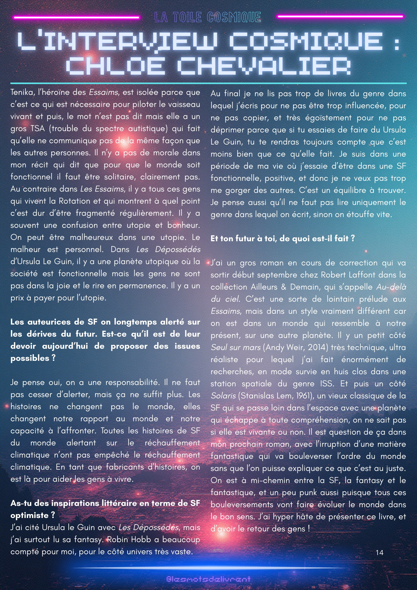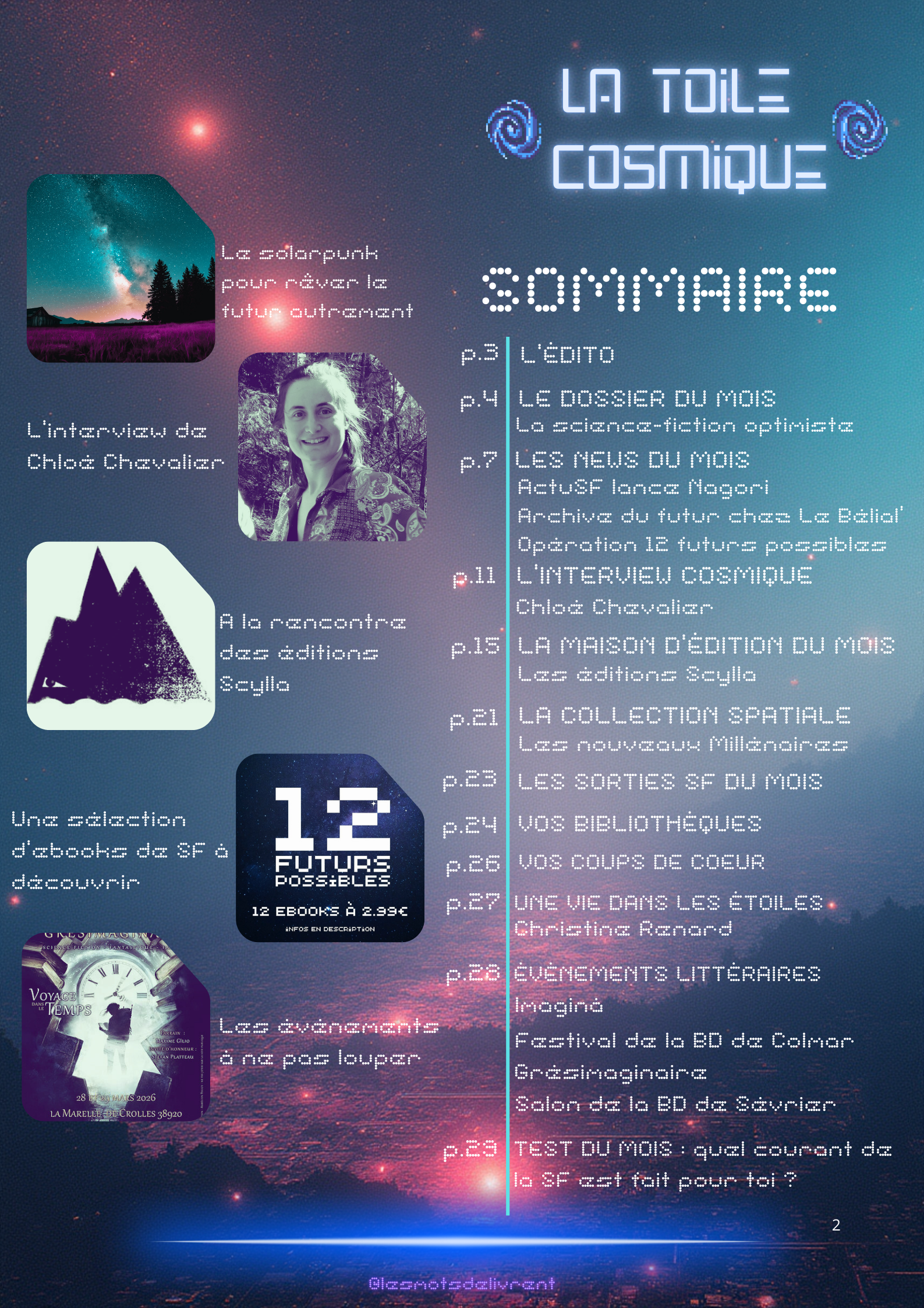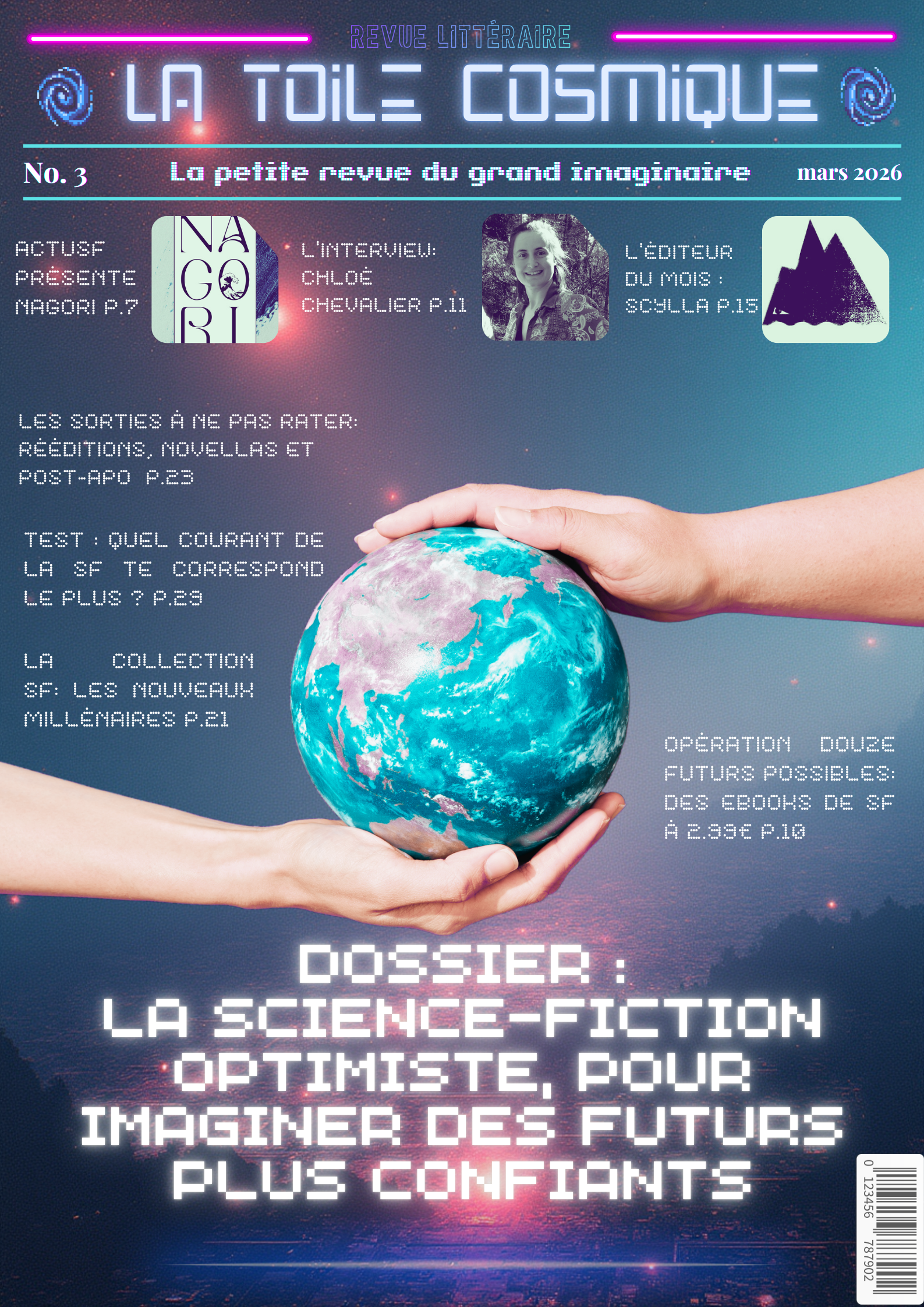 Bienvenue dans ce troisième numéro de La Toile Cosmique, une revue littéraire consacrée à la science-fiction ! Chaque mois, tu pourras y retrouver des interviews d’auteurices, de maisons d’édition indépendantes, des news littéraires, les nouveautés en librairie, des coups de coeur, les bibliothèques des lecteurices, et bien plus encore !