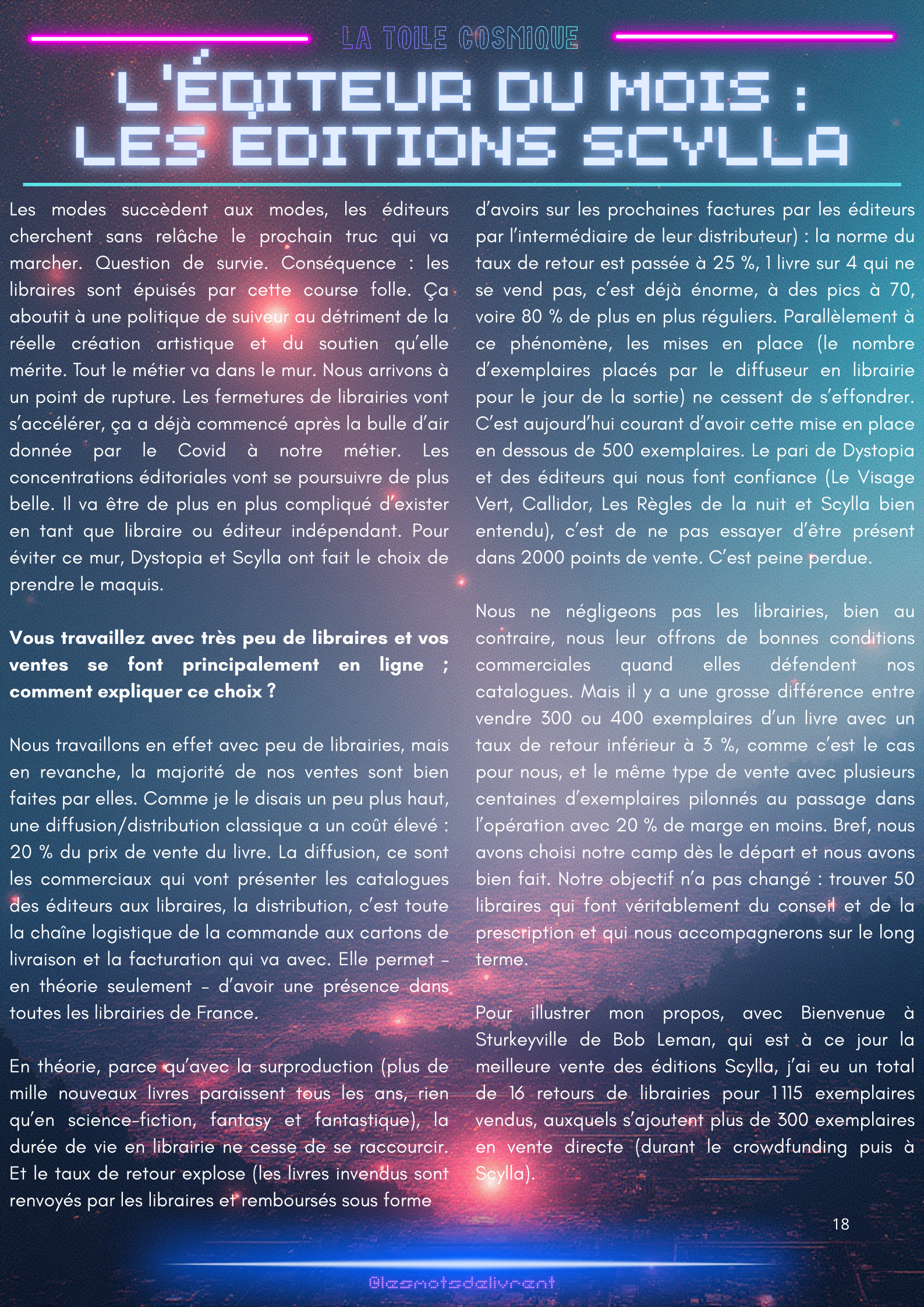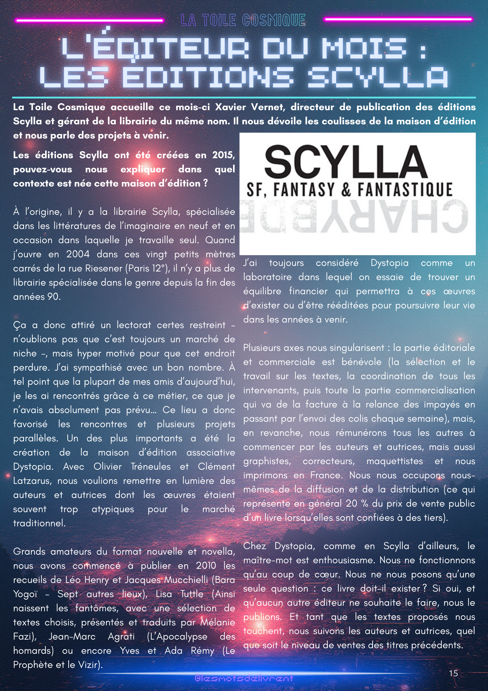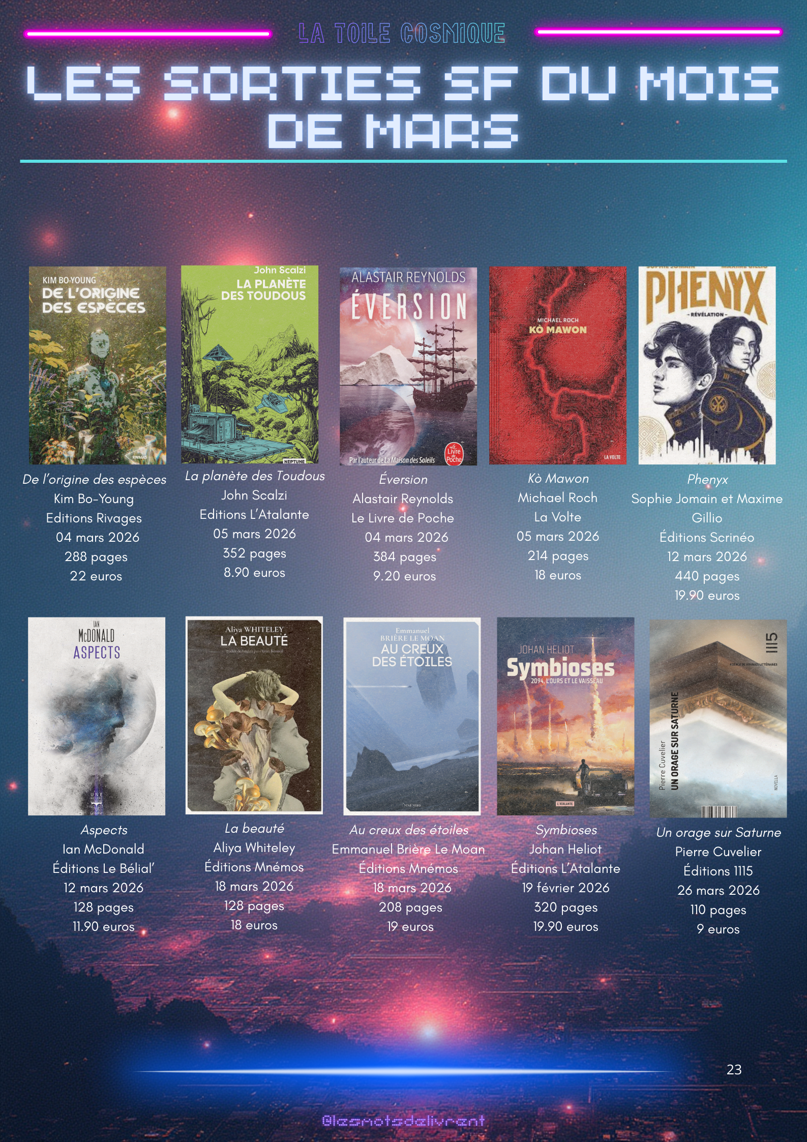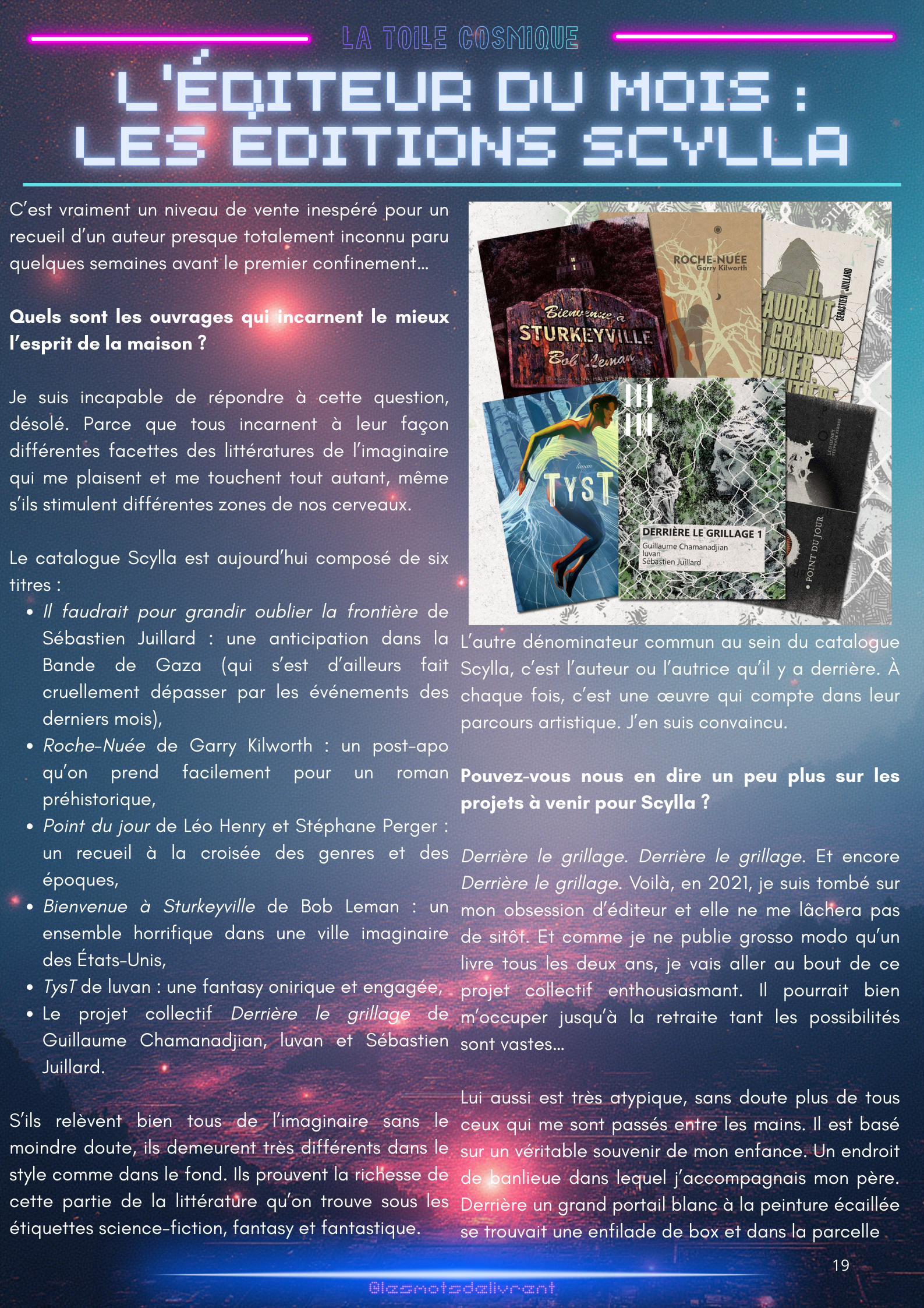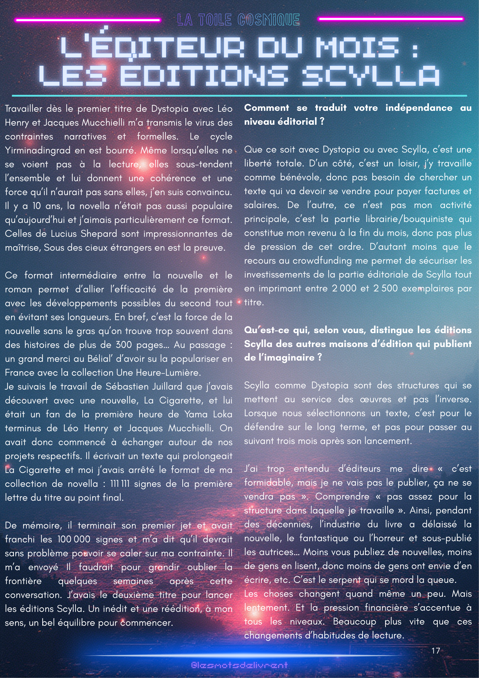 Bienvenue dans ce troisième numéro de La Toile Cosmique, une revue littéraire consacrée à la science-fiction ! Chaque mois, tu pourras y retrouver des interviews d’auteurices, de maisons d’édition indépendantes, des news littéraires, les nouveautés en librairie, des coups de coeur, les bibliothèques des lecteurices, et bien plus encore !