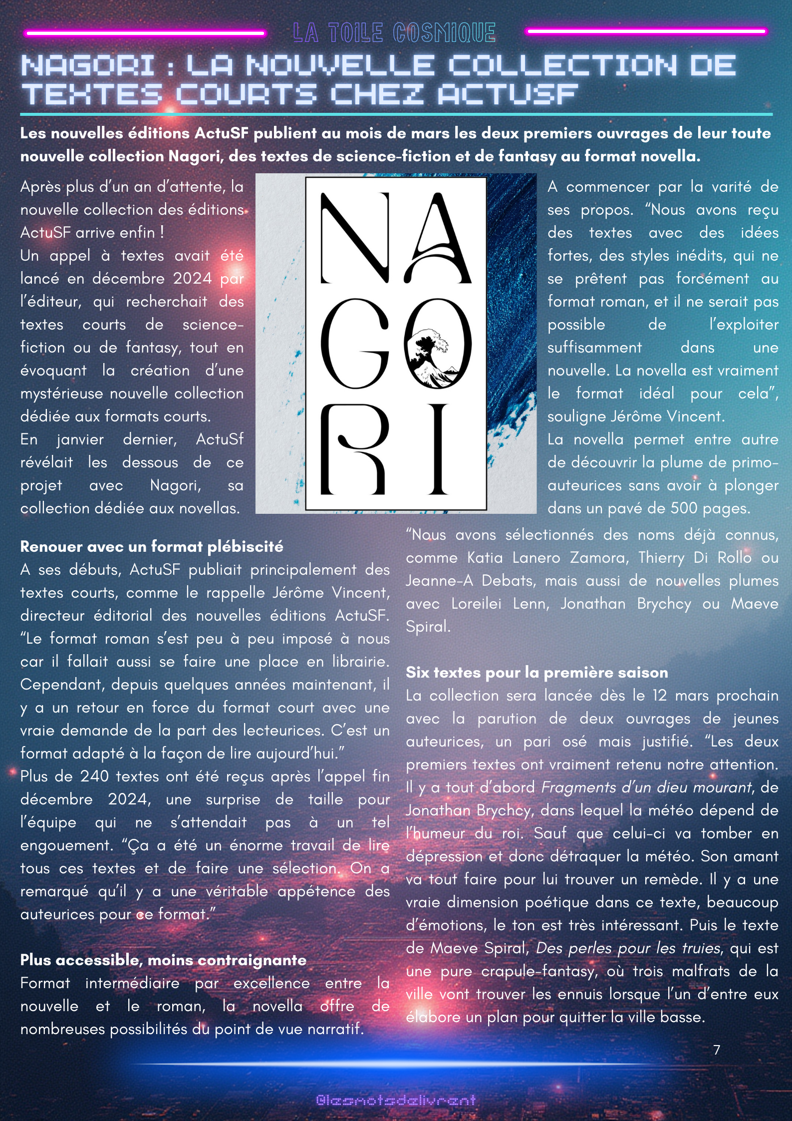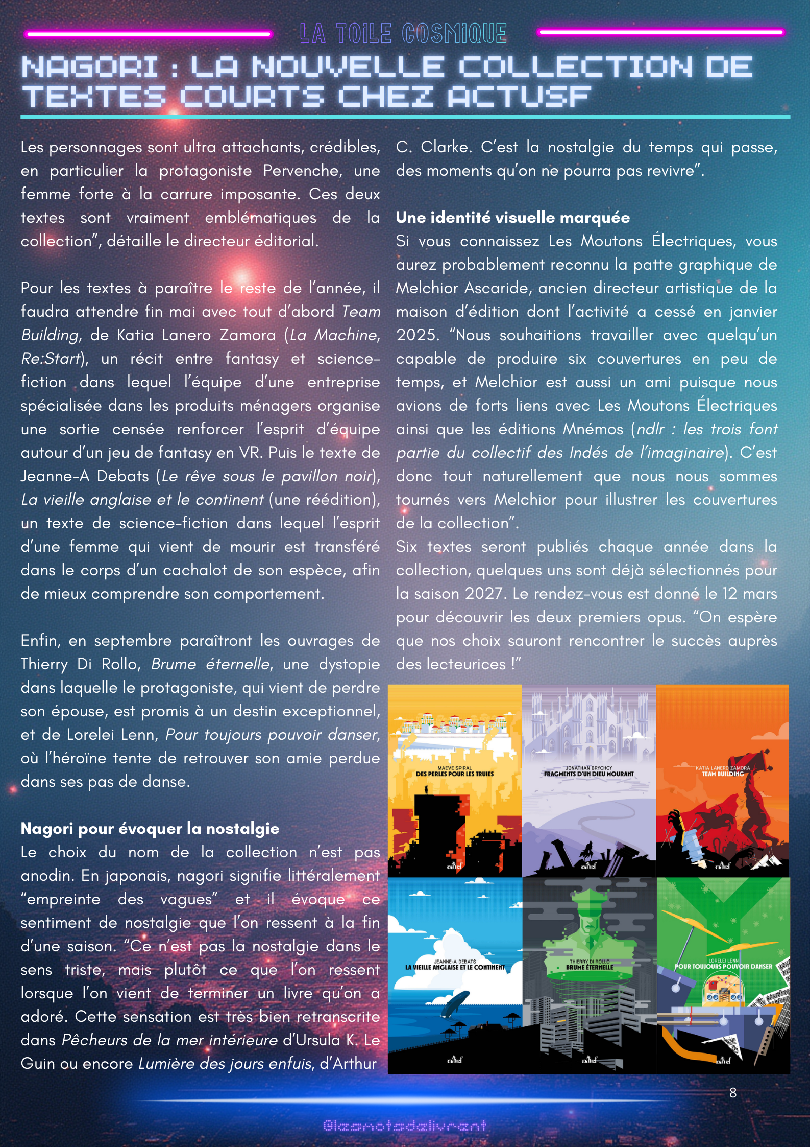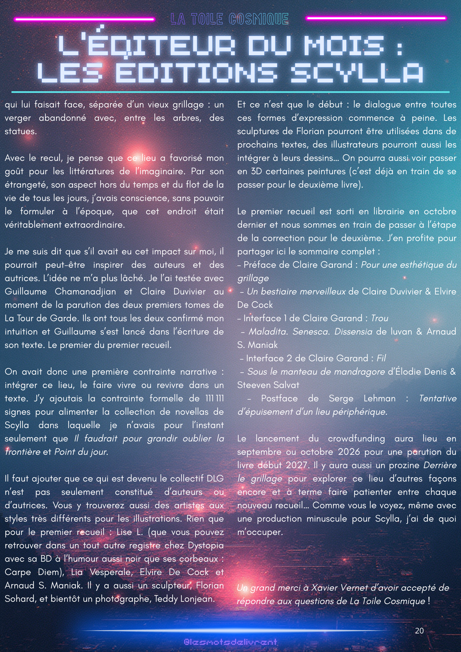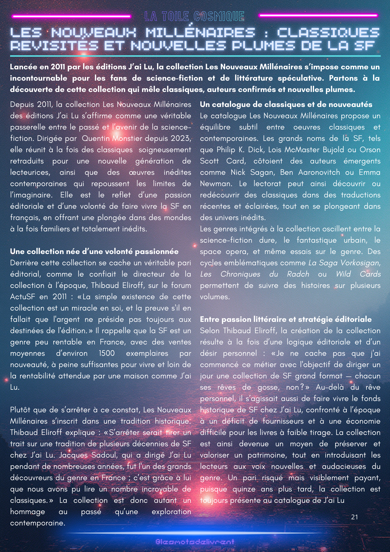 Bienvenue dans ce troisième numéro de La Toile Cosmique, une revue littéraire consacrée à la science-fiction ! Chaque mois, tu pourras y retrouver des interviews d’auteurices, de maisons d’édition indépendantes, des news littéraires, les nouveautés en librairie, des coups de coeur, les bibliothèques des lecteurices, et bien plus encore !