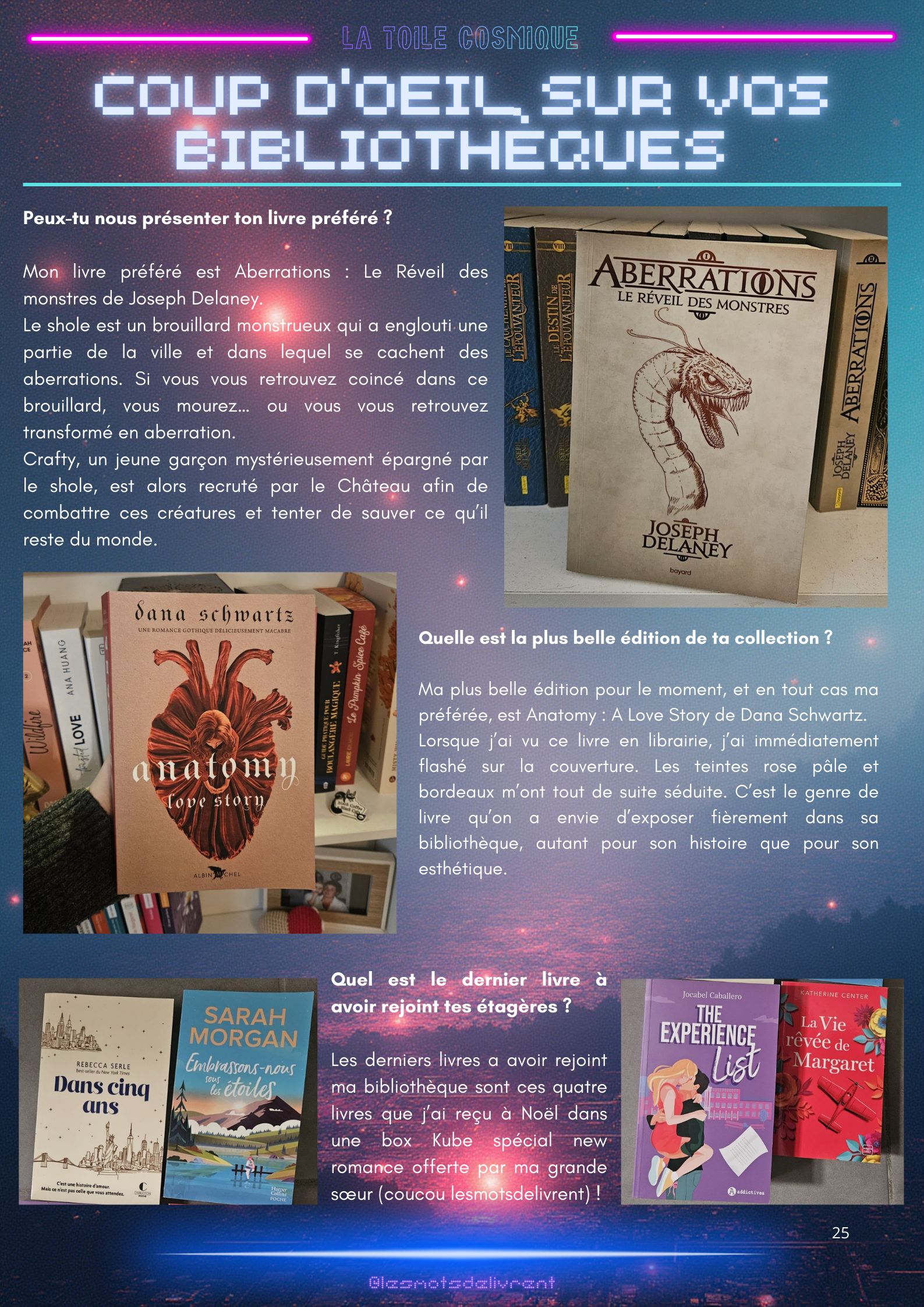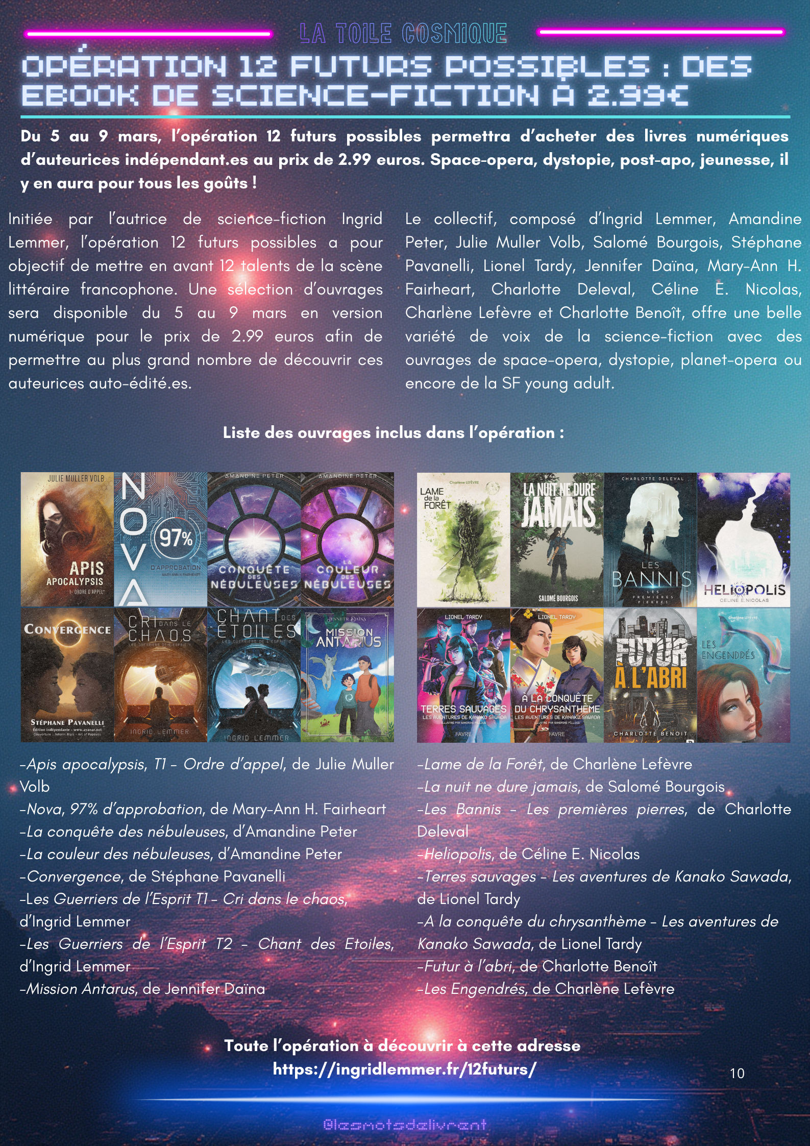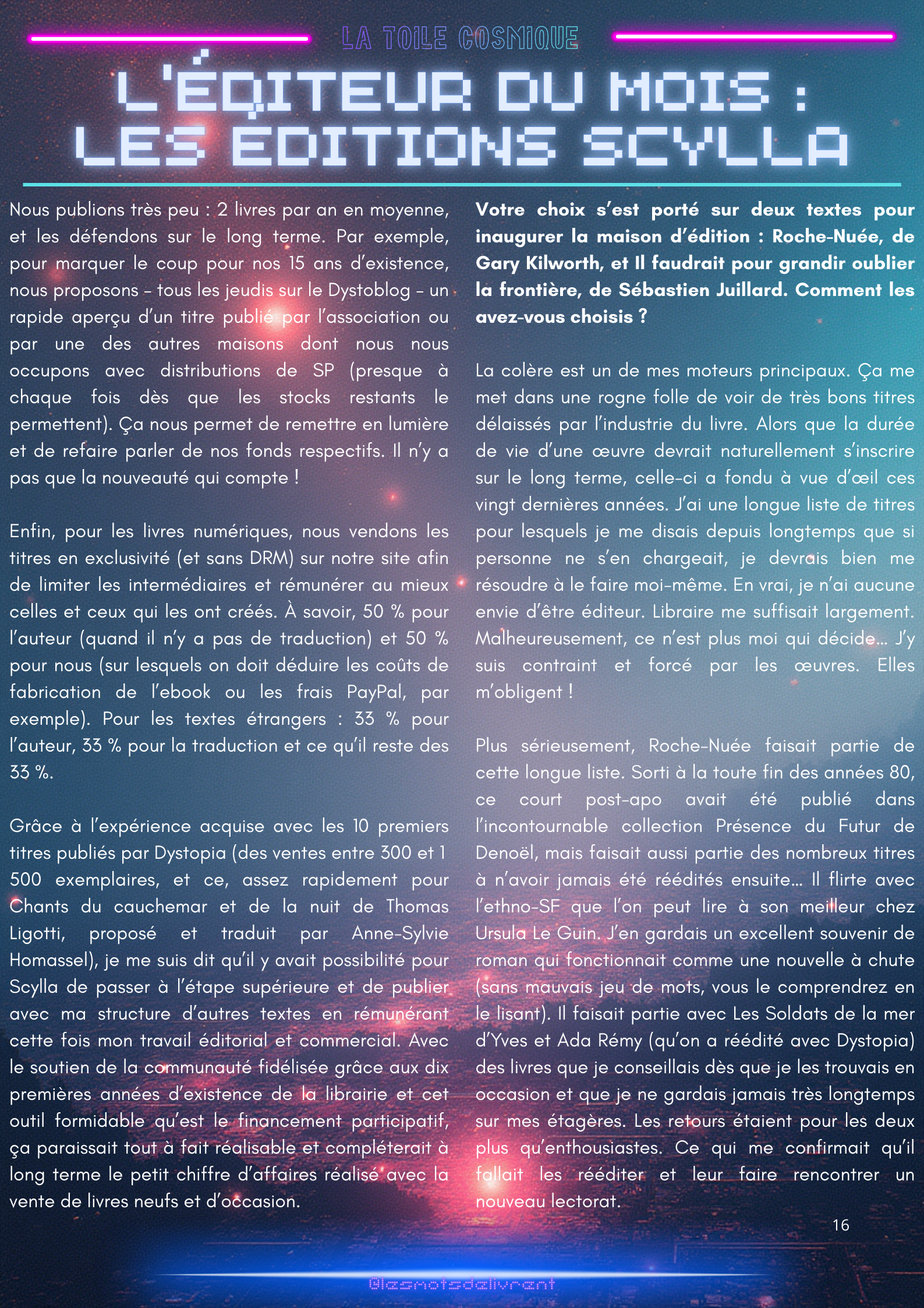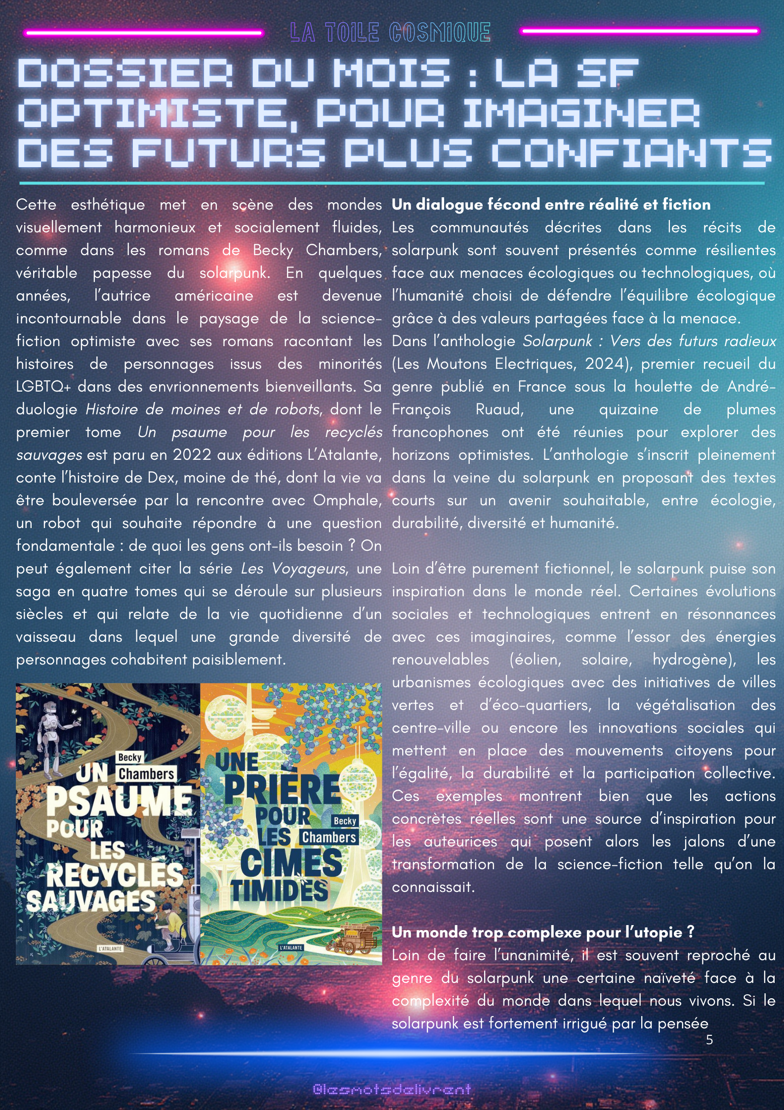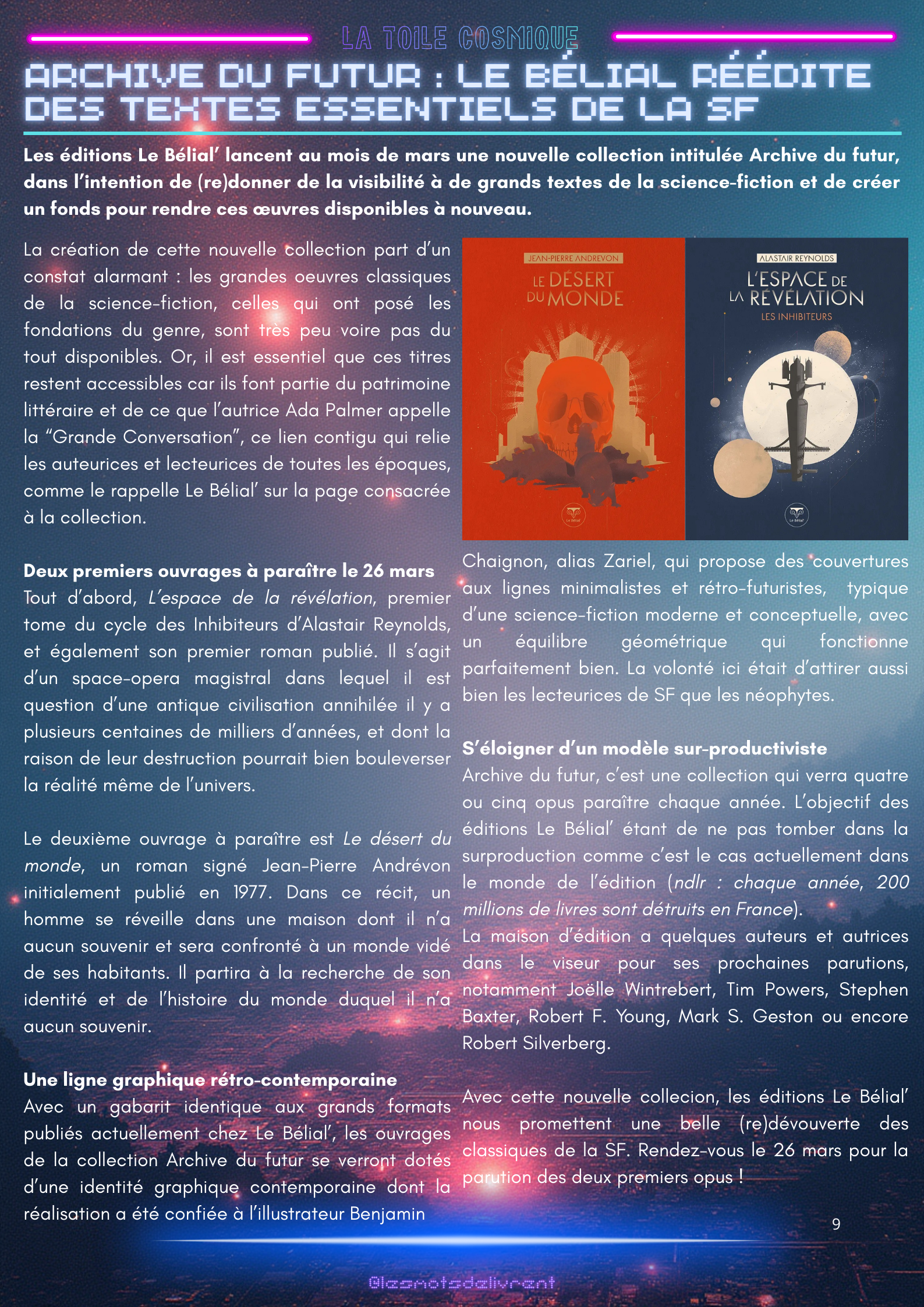 Bienvenue dans ce troisième numéro de La Toile Cosmique, une revue littéraire consacrée à la science-fiction ! Chaque mois, tu pourras y retrouver des interviews d’auteurices, de maisons d’édition indépendantes, des news littéraires, les nouveautés en librairie, des coups de coeur, les bibliothèques des lecteurices, et bien plus encore !