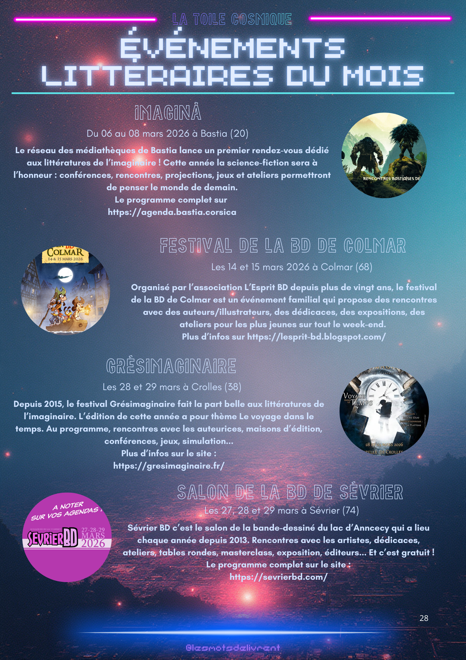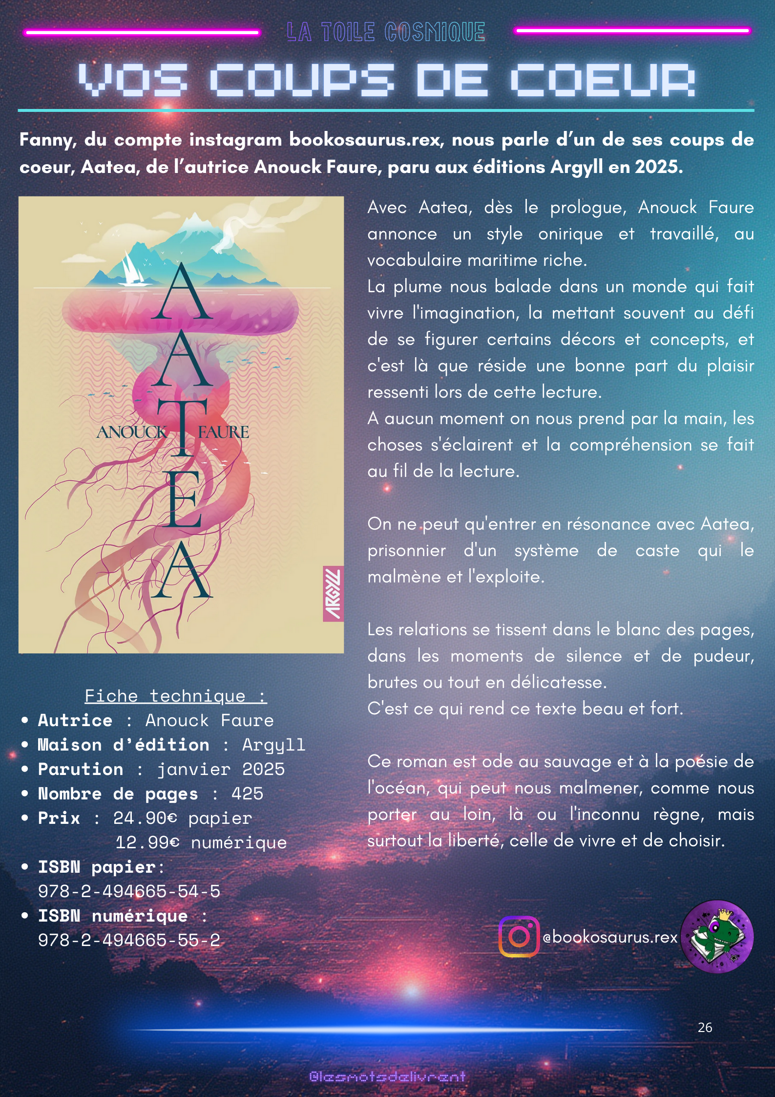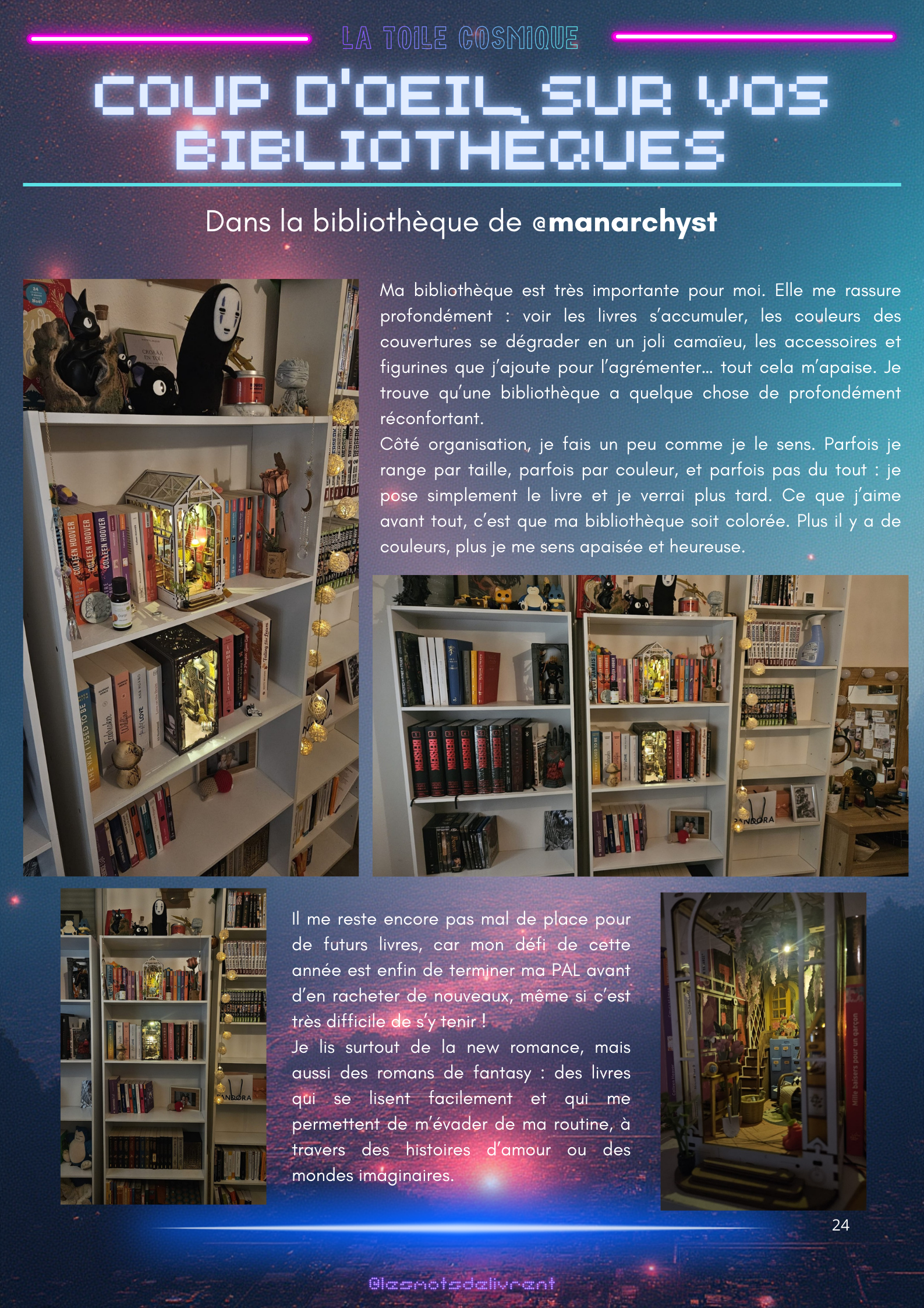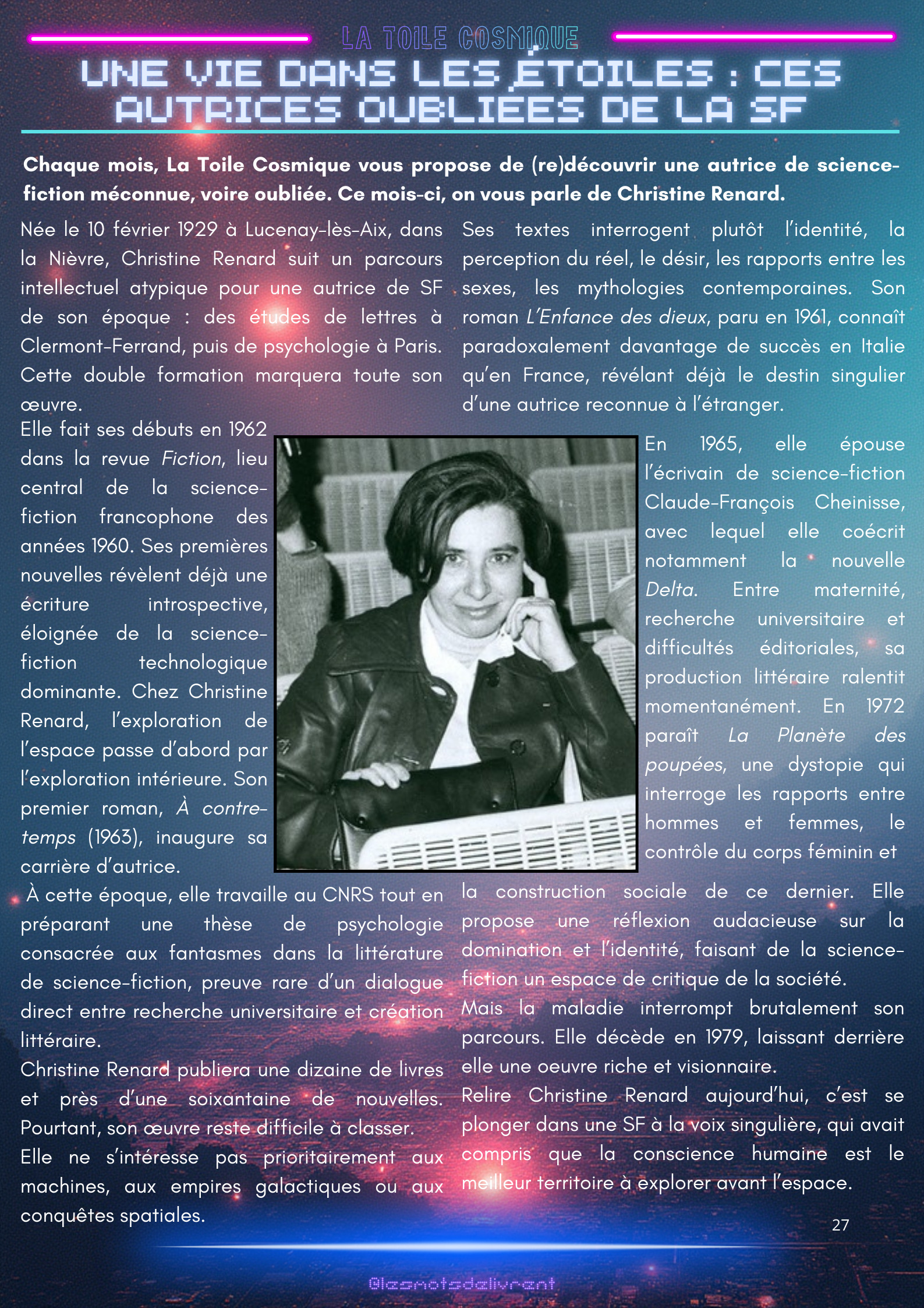 Bienvenue dans ce troisième numéro de La Toile Cosmique, une revue littéraire consacrée à la science-fiction ! Chaque mois, tu pourras y retrouver des interviews d’auteurices, de maisons d’édition indépendantes, des news littéraires, les nouveautés en librairie, des coups de coeur, les bibliothèques des lecteurices, et bien plus encore !
