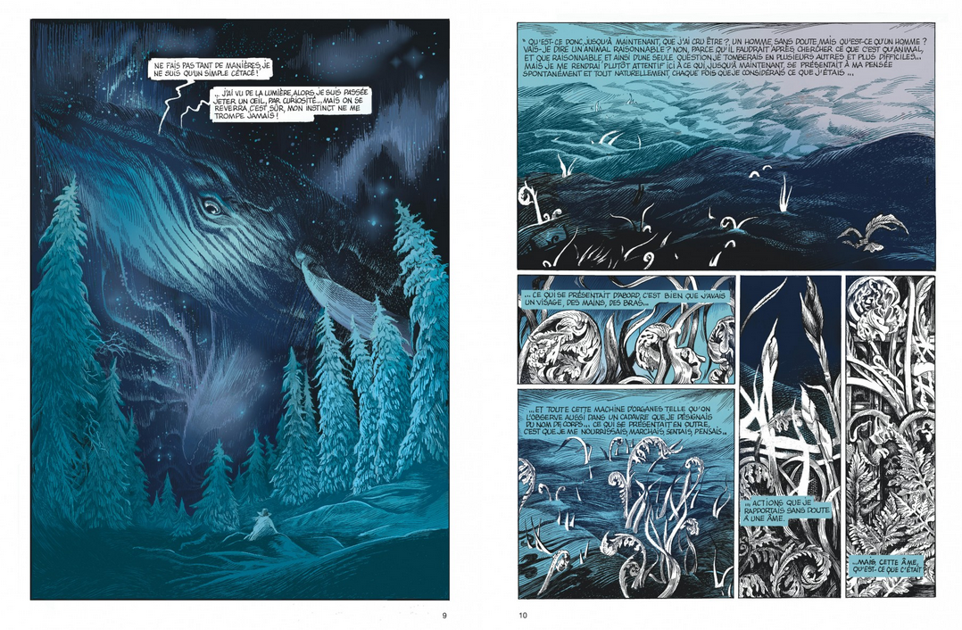 Visuellement, l’album se distingue par un usage très maîtrisé de la couleur, pensée comme un marqueur de temporalité et de réalité. Les premières pages baignent dans des bleus glacés, traduisant l’approche de la mort. Peu à peu, le noir et blanc s’impose, tandis qu’un halo bleuté persiste autour du crâne de Descartes, signe de son statut liminal entre monde matériel et plan spirituel. D’autres séquences, plus oniriques, renouent avec la couleur dans une palette volontairement restreinte, alors que l’épisode de la baleine d’Ostende se déploie en sépia. Cette grammaire visuelle permet de naviguer sans ambiguïté entre histoire et rêverie.