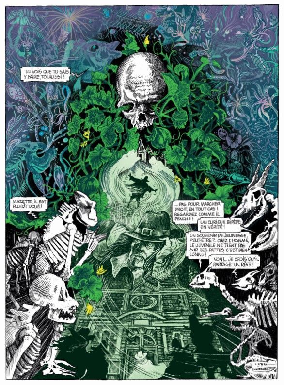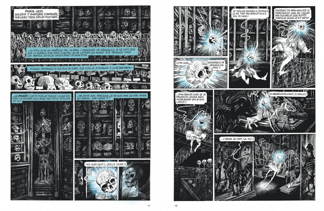 Le dessin, réalisé à la plume, se caractérise par une grande densité graphique, faite d’aplats sombres et de hachures serrées. Les pages, parfois très dialoguées, imposent un rythme de lecture posé et attentif. Les échanges entre le crâne et les squelettes d’animaux conservés au Muséum témoignent d’une inventivité remarquable dans le découpage et les points de vue. Malgré leur nature inanimée, ces ossements acquièrent une présence charnelle, tant leur anatomie est rendue avec précision et respect scientifique. Les décors historiques, qu’ils soient parisiens ou muséaux, bénéficient du même soin documentaire.